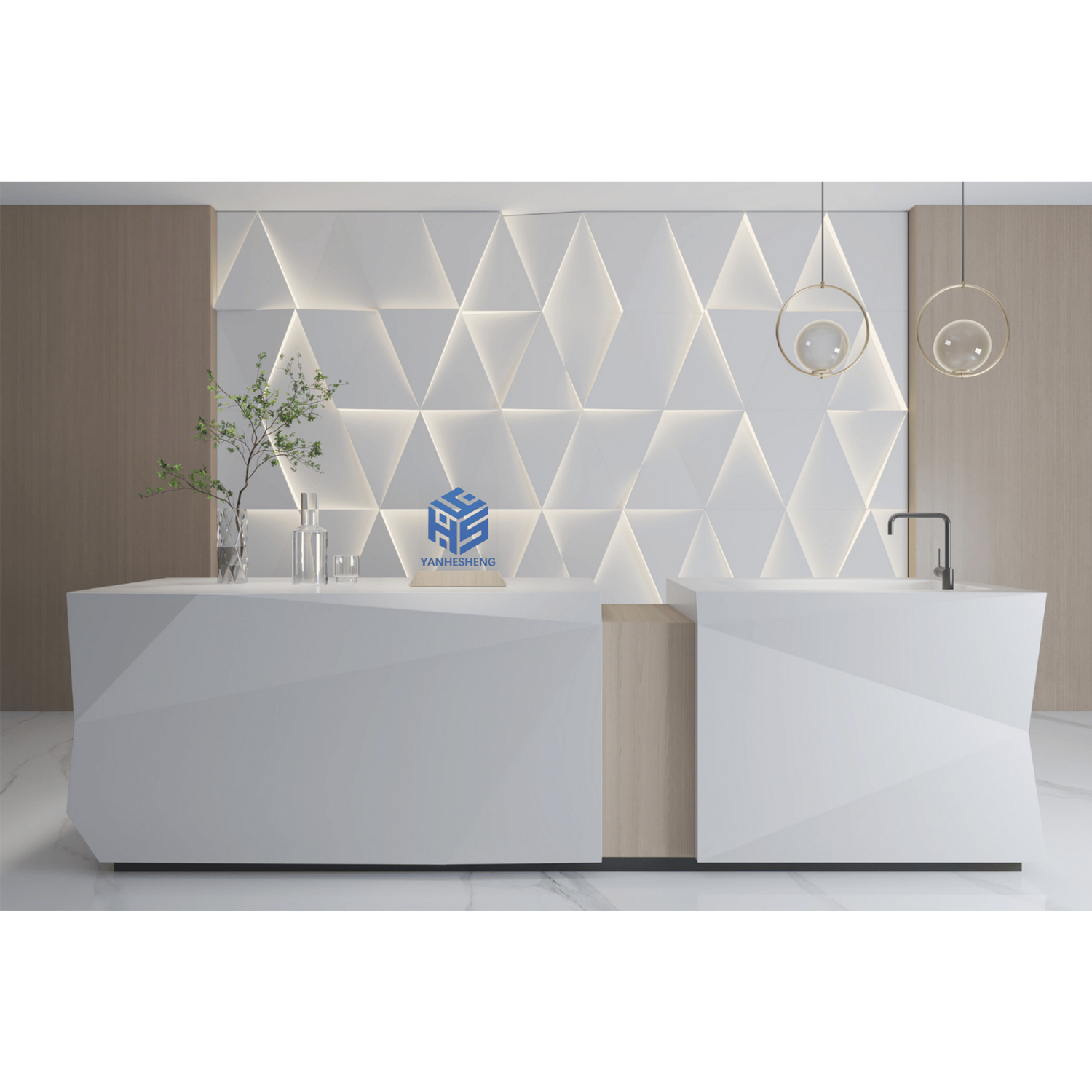 1. Selected Corian solid surface materials, high-quality acrylic artificial stone uses high-purity polymethyl methacrylate (PMMA), which will not release harmful gases, only release carbon monoxide when burning, and the light smoke produced does not contain toxic halogens, which meets the strict safety standards required by the medical environment. It not only ensures the transparency and glossiness of the product, but also provides excellent durability and anti-aging properties.